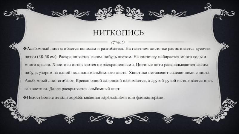 нитки (30-50 см). Раскрашивается каким-нибудь цветом. На кисточку набирается много воды и много краски. Хвостики оставляются не раскрашенными. Цветные нити раскладываются каким-нибудь узором на одной половинке альбомного листа. Хвостики оставляют свисающими с листа. Альбомный лист сгибают. Крепко одной ладошкой нажимается, а другой рукой вытягивается нить за хвостики. Далее раскрывается альбомный лист.