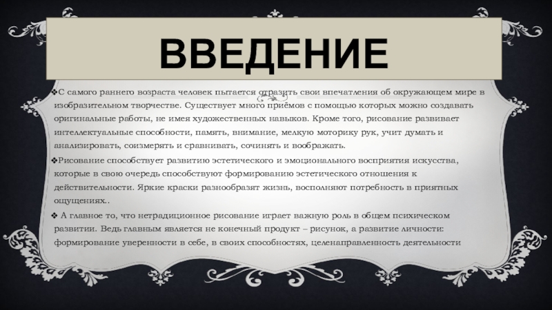 С самого раннего возраста человек пытается отразить свои впечатления об окружающем мире в изобразительном творчестве. Существует много приёмов с помощью которых можно создавать оригинальные работы, не имея художественных навыков. Кроме того, рисование развивает интеллектуальные способности, память, внимание, мелкую моторику рук, учит думать и анализировать, соизмерять и сравнивать, сочинять и воображать.