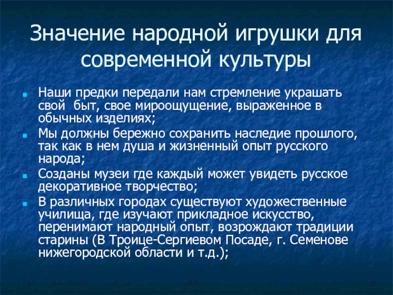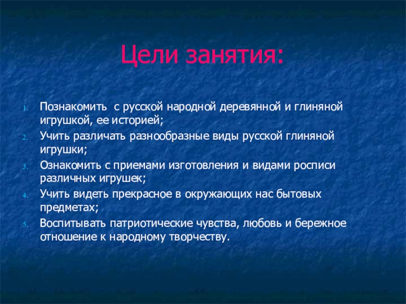 Воспитывать патриотические чувства, любовь и бережное отношение к народному творчеству.