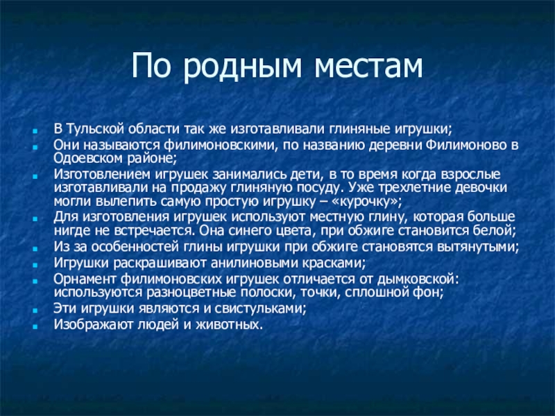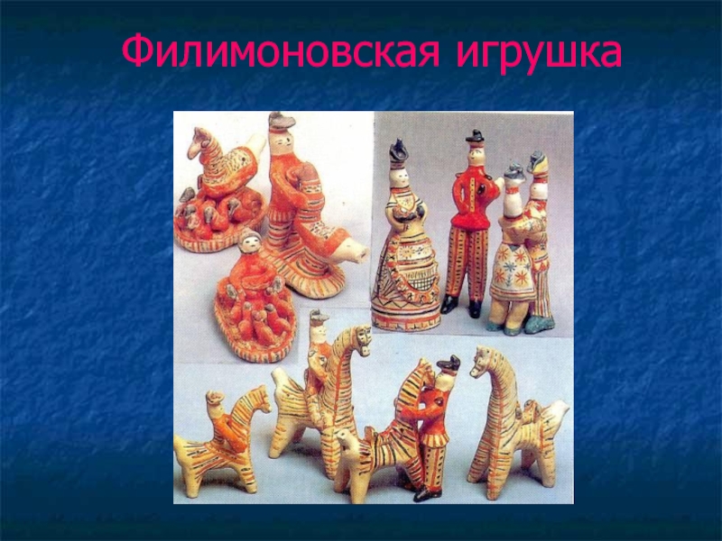 Орнамент филимоновских игрушек отличается от дымковской: используются разноцветные полоски, точки, сплошной фон;