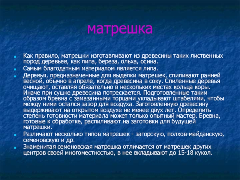 Как правило, матрешки изготавливают из древесины таких лиственных пород деревьев, как