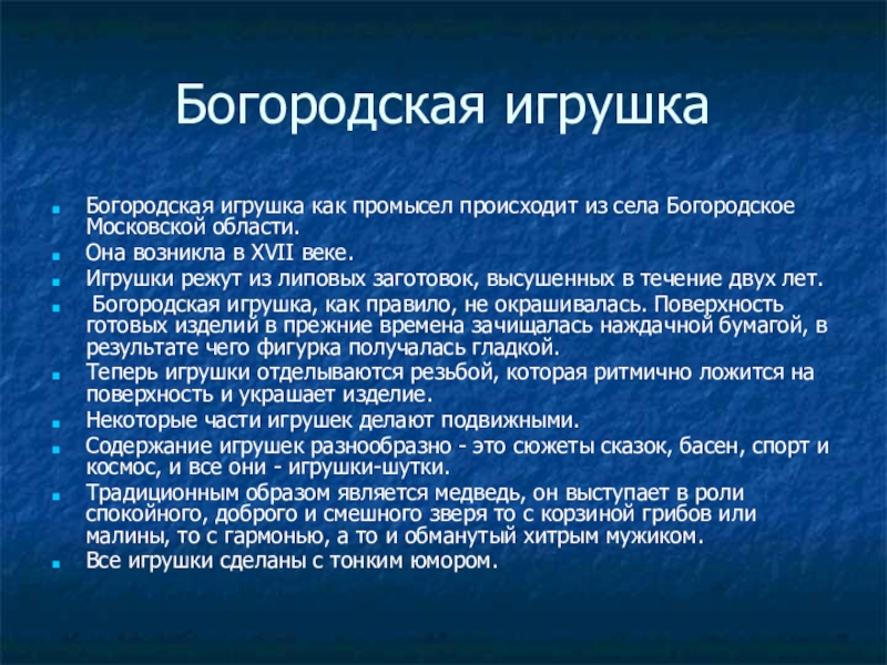Богородская игрушка как промысел происходит из села Богородское Московской области.