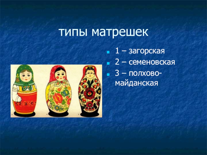 Различают несколько типов матрешек - загорскую, полхов-майданскую, семеновскую и др.