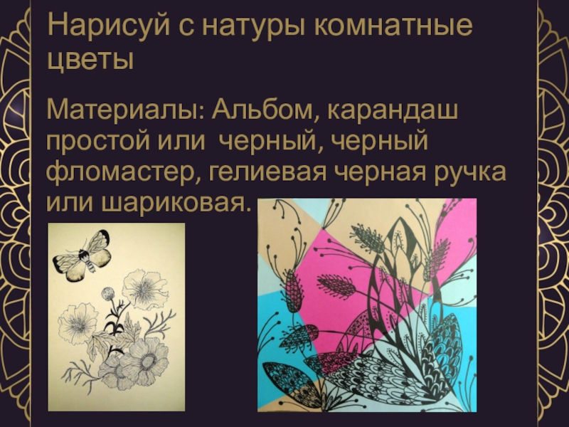Нарисуй с натуры комнатные цветыМатериалы: Альбом, карандаш простой или черный, черный фломастер, гелиевая черная ручка или шариковая.