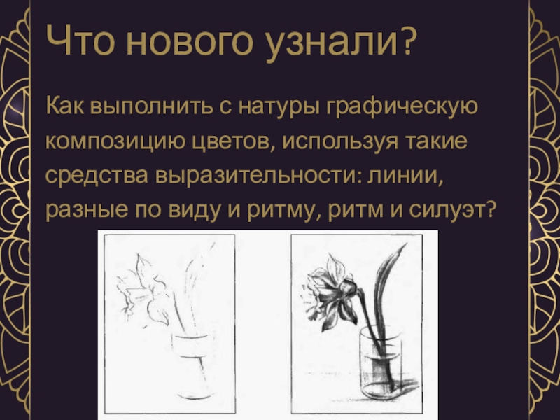 Что нового узнали?Как выполнить с натуры графическуюкомпозицию цветов, используя такиесредства выразительности: линии,разные по виду и ритму, ритм