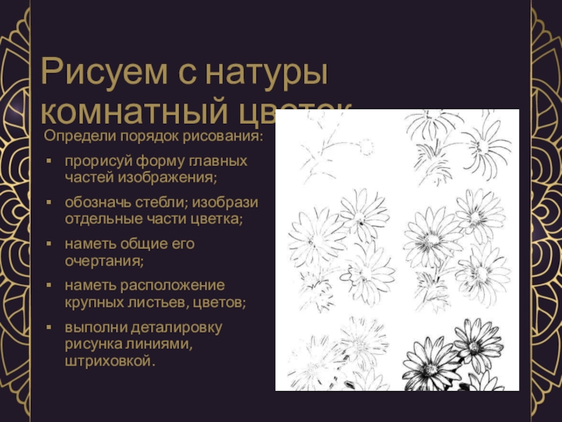 Рисуем с натуры комнатный цветокОпредели порядок рисования:прорисуй форму главных частей изображения; обозначь стебли; изобрази отдельные части цветка;
