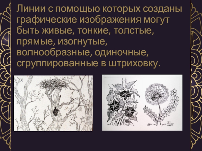 Слайд 5Линии с помощью которых созданы графические изображения могут быть живые, тонкие,