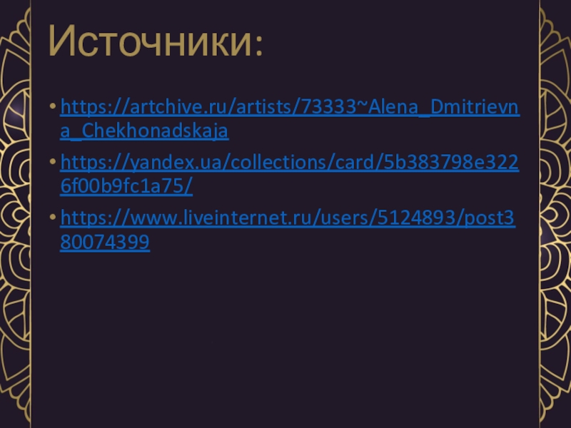 Источники:https://artchive.ru/artists/73333~Alena_Dmitrievna_Chekhonadskajahttps://yandex.ua/collections/card/5b383798e3226f00b9fc1a75/https://www.liveinternet.ru/users/5124893/post380074399