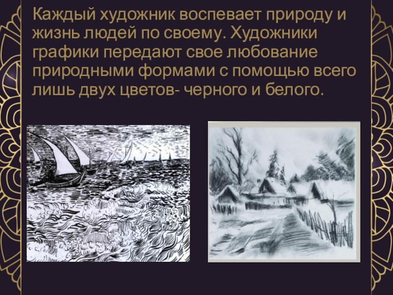 Каждый художник воспевает природу и жизнь людей по своему. Художники графики передают свое любование природными формами с помощью всего лишь двух цветов- черного и белого.