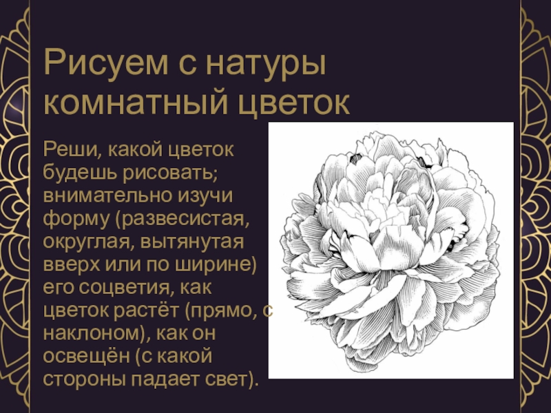 Рисуем с натуры комнатный цветокРеши, какой цветок будешь рисовать; внимательно изучи форму (развесистая, округлая, вытянутая вверх или