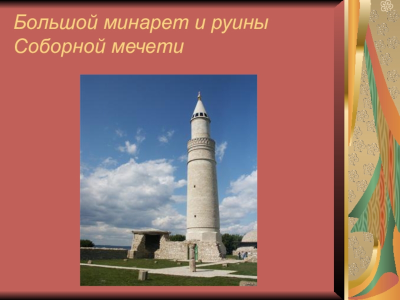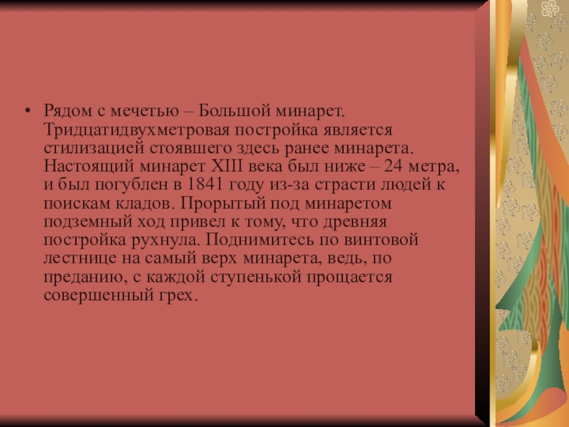 Слайд 7Рядом с мечетью – Большой минарет. Тридцатидвухметровая постройка является стилизацией стоявшего