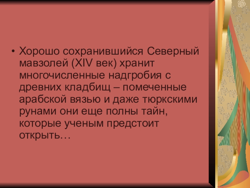 Слайд 9Хорошо сохранившийся Северный мавзолей (XIV век) хранит многочисленные надгробия с древних
