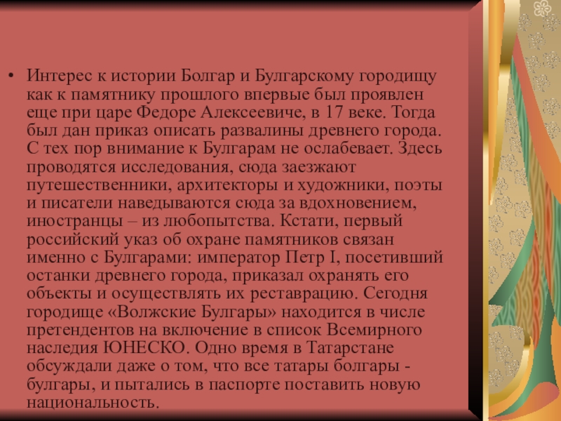 впервые был проявлен еще при царе Федоре Алексеевиче, в 17 веке. Тогда был дан приказ описать развалины древнего города. С тех пор внимание к Булгарам не ослабевает. Здесь проводятся исследования, сюда заезжают путешественники, архитекторы и художники, поэты и писатели наведываются сюда за вдохновением, иностранцы – из любопытства. Кстати, первый российский указ об охране памятников связан именно с Булгарами: император Петр I, посетивший останки древнего города, приказал охранять его объекты и осуществлять их реставрацию. Сегодня городище «Волжские Булгары» находится в числе претендентов на включение в список Всемирного наследия ЮНЕСКО. Одно время в Татарстане обсуждали даже о том, что все татары болгары - булгары, и пытались в паспорте поставить новую национальность.