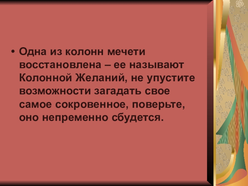 Слайд 6Одна из колонн мечети восстановлена – ее называют Колонной Желаний, не
