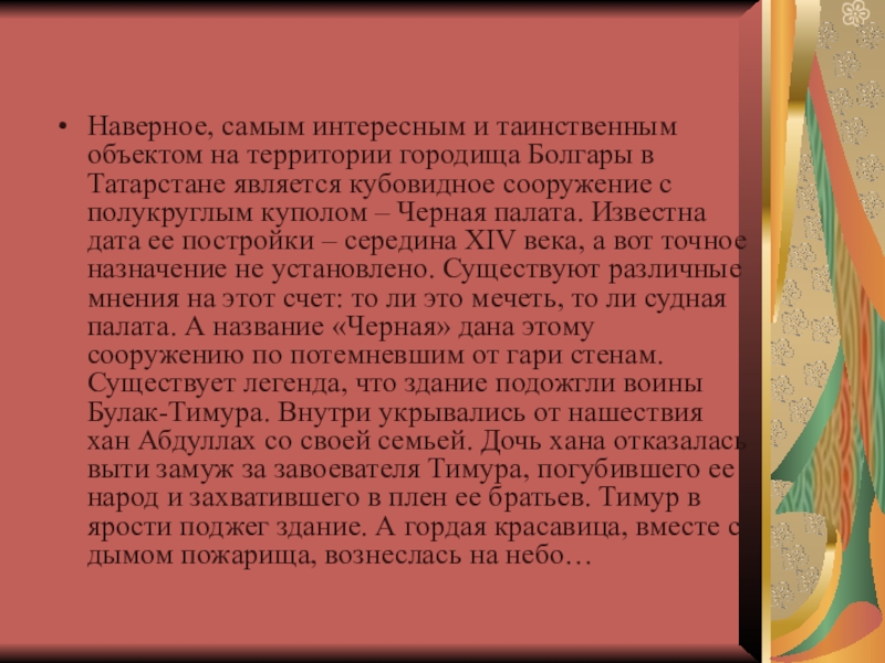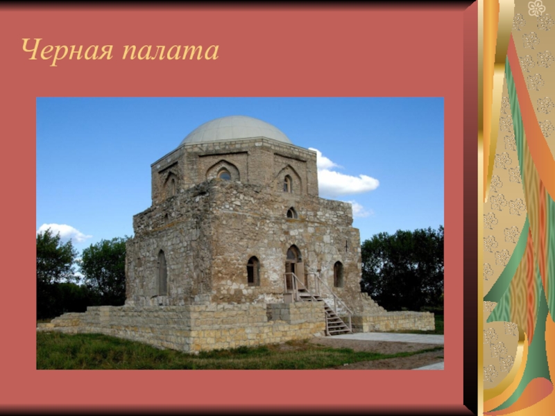 Татарстане является кубовидное сооружение с полукруглым куполом – Черная палата. Известна дата ее постройки – середина XIV века, а вот точное назначение не установлено. Существуют различные мнения на этот счет: то ли это мечеть, то ли судная палата. А название «Черная» дана этому сооружению по потемневшим от гари стенам. Существует легенда, что здание подожгли воины Булак-Тимура. Внутри укрывались от нашествия хан Абдуллах со своей семьей. Дочь хана отказалась выти замуж за завоевателя Тимура, погубившего ее народ и захватившего в плен ее братьев. Тимур в ярости поджег здание. А гордая красавица, вместе с дымом пожарища, вознеслась на небо…