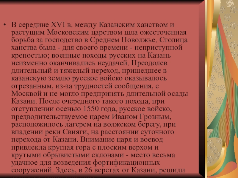 шла ожесточенная борьба за господство в Среднем Поволжье. Столица ханства была - для своего времени - неприступной крепостью; военные походы русских на Казань неизменно оканчивались неудачей. Преодолев длительный и тяжелый переход, пришедшее в казанскую землю русское войско оказывалось отрезанным, из-за трудностей сообщения, с Москвой и не могло предпринять длительной осады Казани. После очередного такого похода, при отступлении осенью 1550 года, русское войско, предводительствуемое царем Иваном Грозным, расположилось лагерем на волжском берегу, при впадении реки Свияги, на расстоянии суточного перехода от Казани. Внимание царя и воевод привлекла круглая гора с плоским верхом и крутыми обрывистыми склонами - место весьма удачное для возведения фортификационных сооружений. Здесь, в 26 верстах от Казани, решили заложить город-крепость.