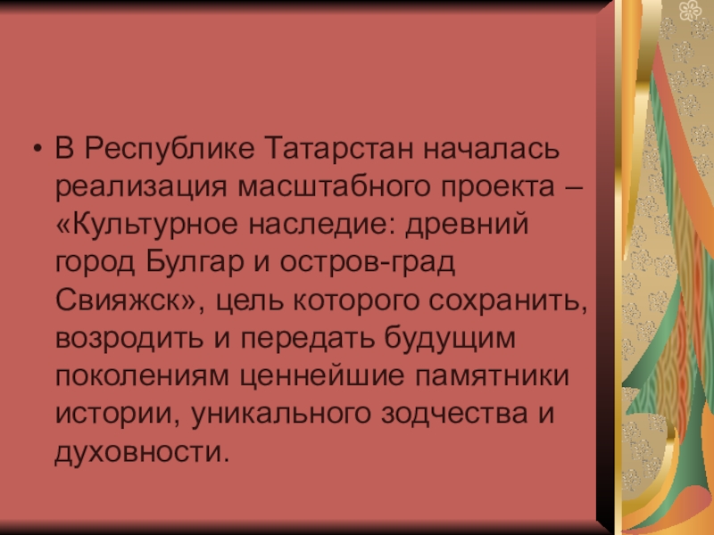 Слайд 2В Республике Татарстан началась реализация масштабного проекта – «Культурное наследие: древний
