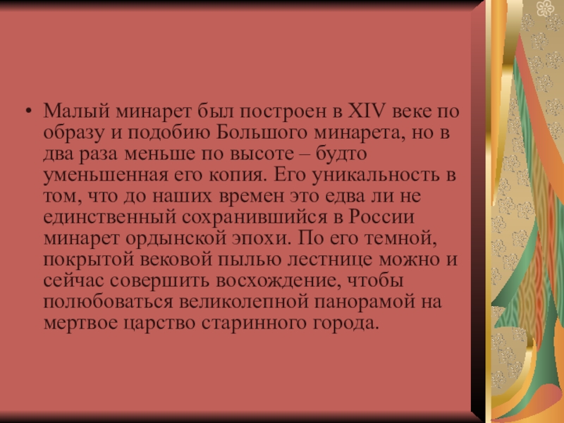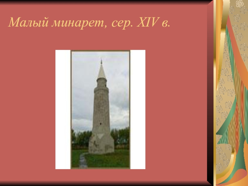 Слайд 17Малый минарет был построен в XIV веке по образу и подобию