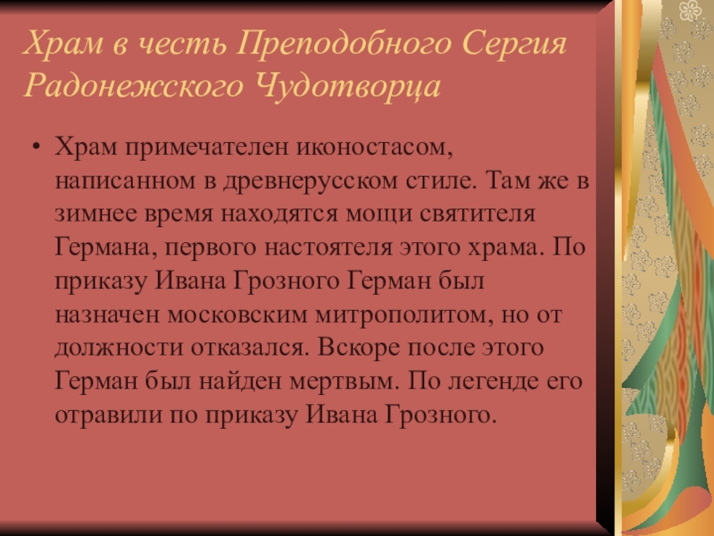 древнерусском стиле. Там же в зимнее время находятся мощи святителя Германа, первого настоятеля этого храма. По приказу Ивана Грозного Герман был назначен московским митрополитом, но от должности отказался. Вскоре после этого Герман был найден мертвым. По легенде его отравили по приказу Ивана Грозного.