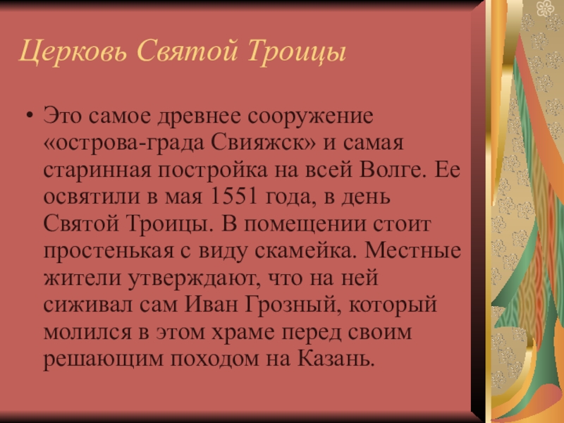 постройка на всей Волге. Ее освятили в мая 1551 года, в день Святой Троицы. В помещении стоит простенькая с виду скамейка. Местные жители утверждают, что на ней сиживал сам Иван Грозный, который молился в этом храме перед своим решающим походом на Казань.