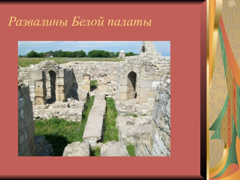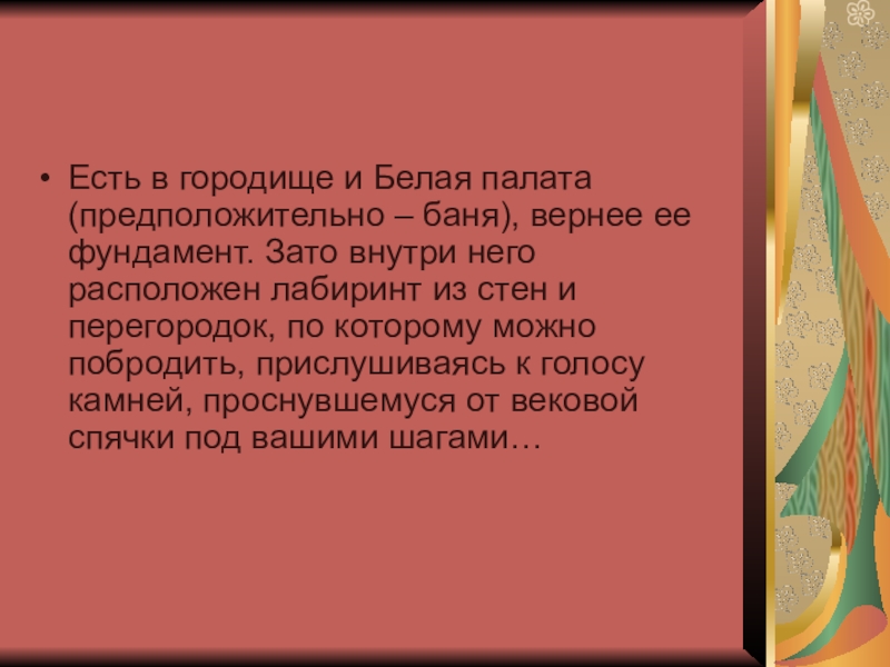 Слайд 13Есть в городище и Белая палата (предположительно – баня), вернее ее