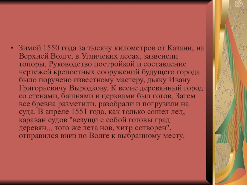 в Угличских лесах, зазвенели топоры. Руководство постройкой и составление чертежей крепостных сооружений будущего города было поручено известному мастеру, дьяку Ивану Григорьевичу Выродкову. К весне деревянный город со стенами, башнями и церквами был готов. Затем все бревна разметили, разобрали и погрузили на суда. В апреле 1551 года, как только сошел лед, караван судов "везущи с собой готовы град деревян... того же лета нов, хитр сотворен", отправился вниз по Волге к выбранному месту.
