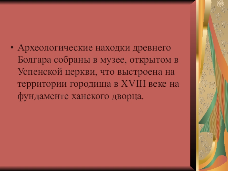 Слайд 19Археологические находки древнего Болгара собраны в музее, открытом в Успенской церкви,