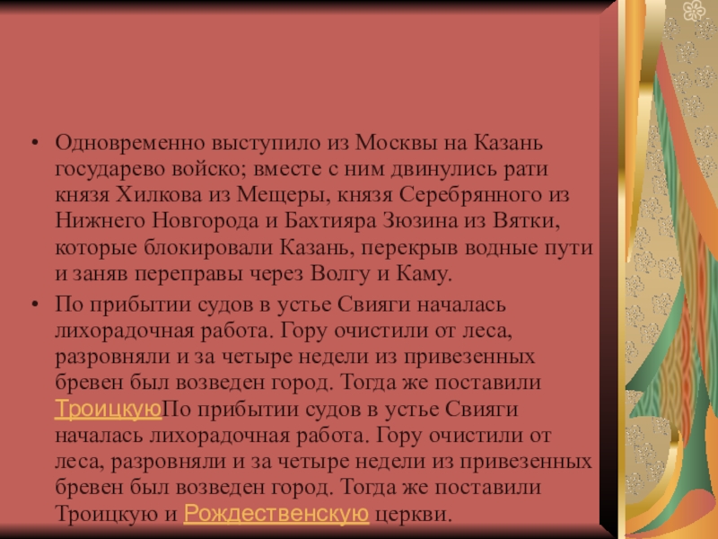 По прибытии судов в устье Свияги началась лихорадочная работа. Гору очистили от леса, разровняли и за четыре недели из привезенных бревен был возведен город. Тогда же поставили ТроицкуюПо прибытии судов в устье Свияги началась лихорадочная работа. Гору очистили от леса, разровняли и за четыре недели из привезенных бревен был возведен город. Тогда же поставили Троицкую и Рождественскую церкви.
