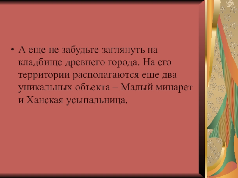 Слайд 15А еще не забудьте заглянуть на кладбище древнего города. На его