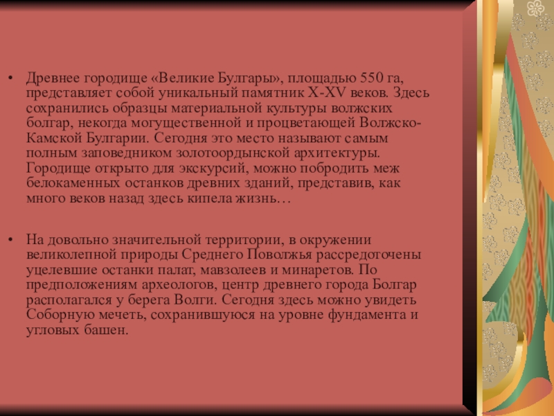 Слайд 5Древнее городище «Великие Булгары», площадью 550 га, представляет собой уникальный памятник
