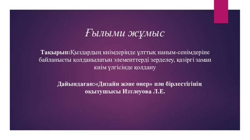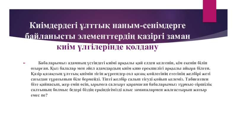 Тақырып:Қыздардың киімдерінде ұлттық наным-сенімдеріне байланысты қолданылатын элементтерді зерделеу, қазіргі заман