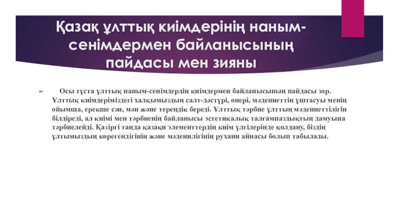 Слайд 11Қазақ ұлттық киімдерінің наным-сенімдермен байланысының пайдасы мен зияны