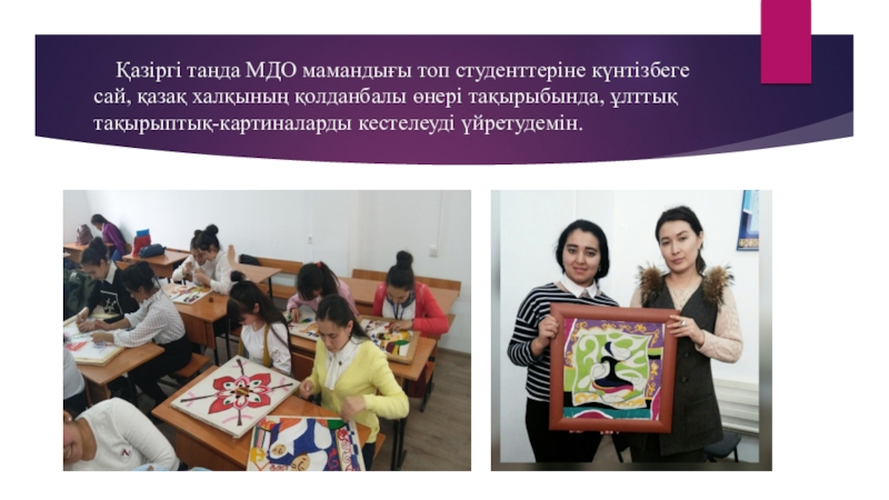 халқының қолданбалы өнері тақырыбында, ұлттық тақырыптық-картиналарды кестелеуді үйретудемін.