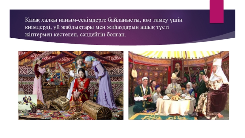 Слайд 13Қазақ халқы наным-сенімдерге байланысты, көз тимеу үшін киімдерді, үй жабдықтары мен