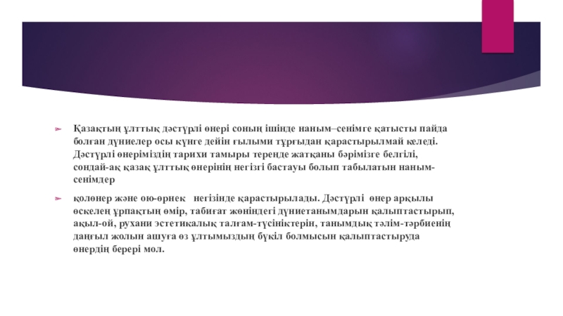Слайд 5Қазақтың ұлттық дәстүрлі өнері соның ішінде наным–сенімге қатысты пайда болған дүниелер