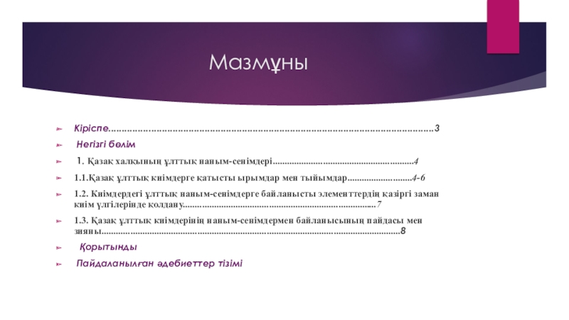 1.3. Қазақ ұлттық киімдерінің наным-сенімдермен байланысының пайдасы мен зияны.............................................................................................................................8