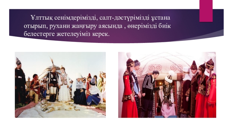 Слайд 12 Ұлттық сенімдерімізді, салт-дәстүрімізді ұстана отырып, рухани жаңғыру аясында ,