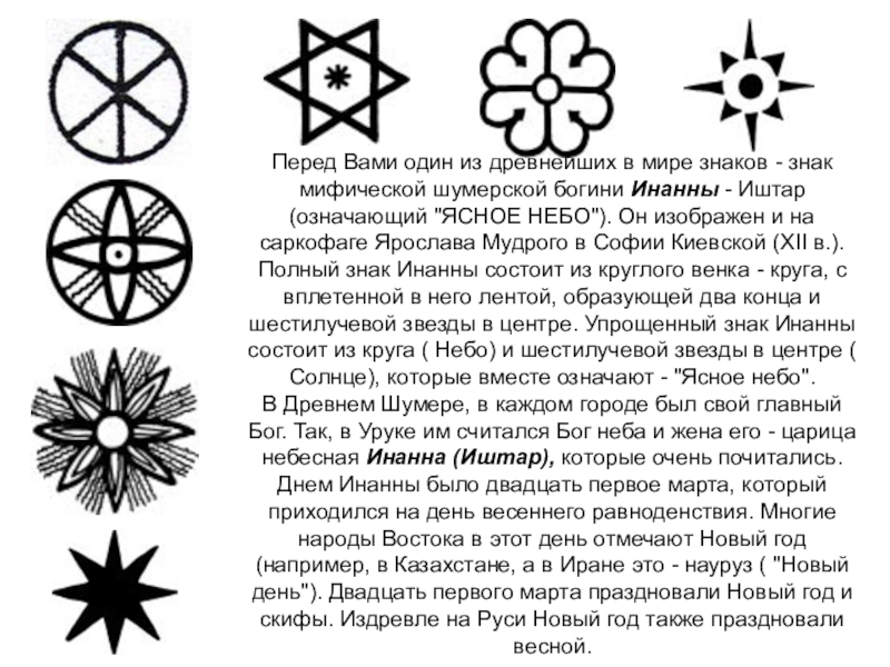 шумерской богини Инанны - Иштар (означающий "ЯСНОЕ НЕБО"). Он изображен и на саркофаге Ярослава Мудрого в Софии Киевской (XII в.). Полный знак Инанны состоит из круглого венка - круга, с вплетенной в него лентой, образующей два конца и шестилучевой звезды в центре. Упрощенный знак Инанны состоит из круга ( Небо) и шестилучевой звезды в центре ( Солнце), которые вместе означают - "Ясное небо".