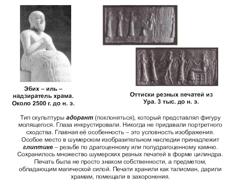 Особое место в шумерском изобразительном наследии принадлежит глиптике – резьбе по драгоценному или полудрагоценному камню.