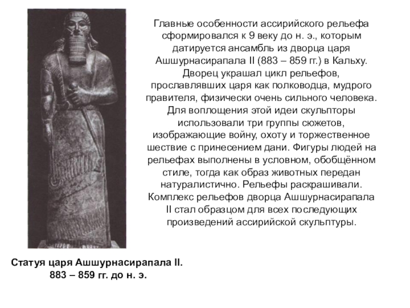 особенности ассирийского рельефа сформировался к 9 веку до н. э., которым датируется ансамбль из дворца царя Ашшурнасирапала II (883 – 859 гг.) в Кальху. Дворец украшал цикл рельефов, прославлявших царя как полководца, мудрого правителя, физически очень сильного человека.