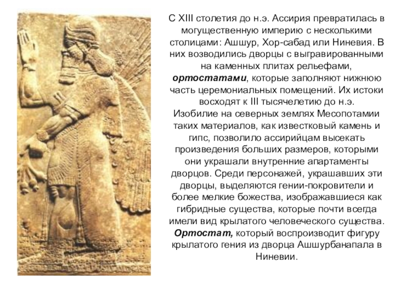 Изобилие на северных землях Месопотамии таких материалов, как известковый камень и гипс, позволило ассирийцам высекать произведения больших размеров, которыми они украшали внутренние апартаменты дворцов. Среди персонажей, украшавших эти дворцы, выделяются гении-покровители и более мелкие божества, изображавшиеся как гибридные существа, которые почти всегда имели вид крылатого человеческого существа. Ортостат, который воспроизводит фигуру крылатого гения из дворца Ашшурбанапала в Ниневии.