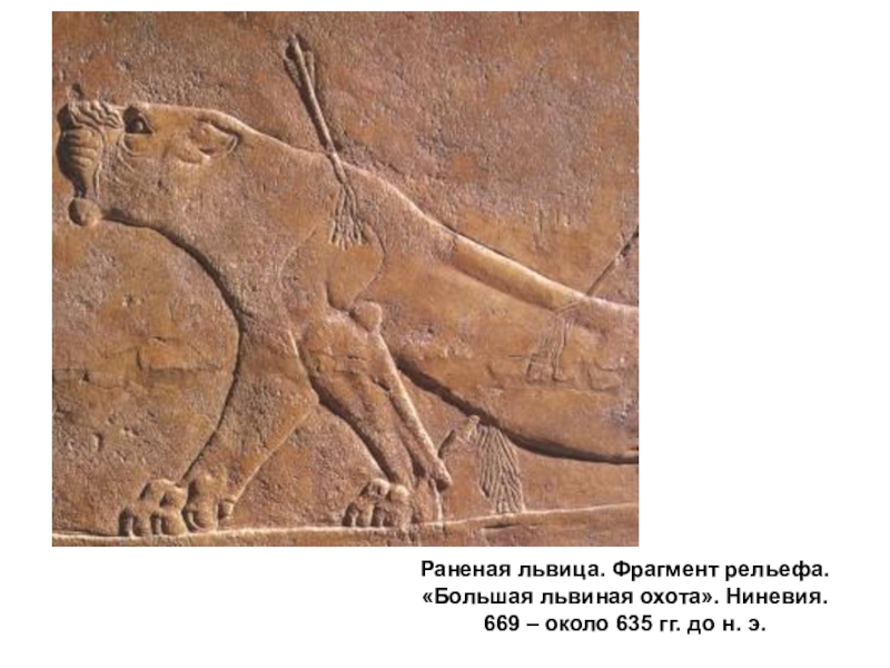 Раненая львица. Фрагмент рельефа. «Большая львиная охота». Ниневия.