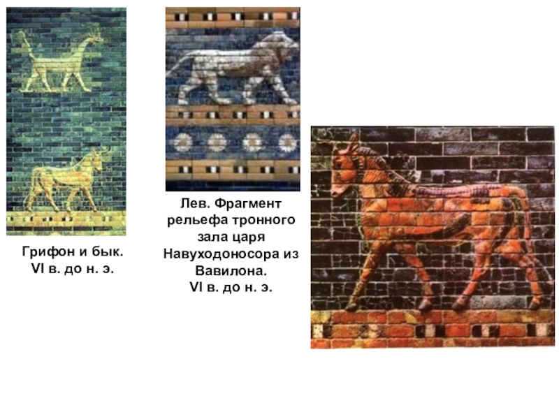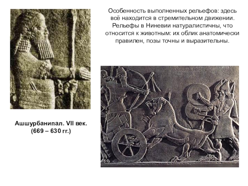 в стремительном движении. Рельефы в Ниневии натуралистичны, что относится к животным: их облик анатомически правилен, позы точны и выразительны.