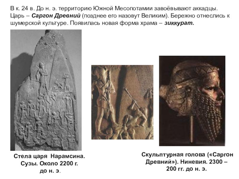 В к. 24 в. До н. э. территорию Южной Месопотамии завоёвывают аккадцы. Царь – Саргон Древний (позднее его назовут Великим). Бережно отнеслись к шумерской культуре. Появилась новая форма храма – зиккурат.