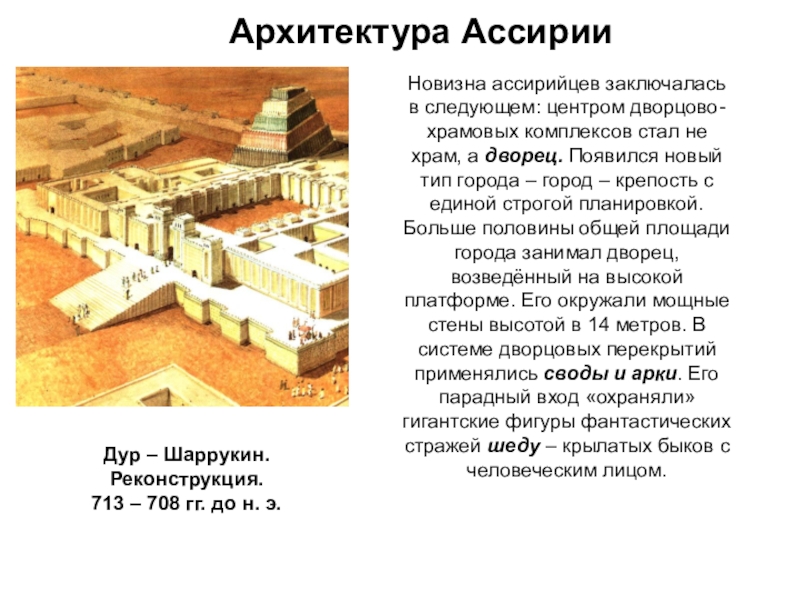 а дворец. Появился новый тип города – город – крепость с единой строгой планировкой. Больше половины общей площади города занимал дворец, возведённый на высокой платформе. Его окружали мощные стены высотой в 14 метров. В системе дворцовых перекрытий применялись своды и арки. Его парадный вход «охраняли» гигантские фигуры фантастических стражей шеду – крылатых быков с человеческим лицом.