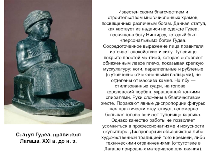 и строительством многочисленных храмов, посвященных различным богам. Данная статуя, как явствует из надписи на одежде Гудеа, посвящена богу Нингирсу, который был «персональным» богом Гудеа. Сосредоточенное выражение лица правителя источает спокойствие и силу. Туловище покрыто простой мантией, которая оставляет обнаженным левое плечо, показывая крепкую мускулатуру; ноги, параллельные и рубленые (с утонченно отчеканенными пальцами), не отделены от массива камня. На лбу — стилизованные кудри, на голове — королевский тюрбан, украшенный тонкими спиралями. Руки сложены в благочестивом жесте. Поражают явные диспропорции фигуры: шея практически отсутствует, непомерно большая голова венчает туловище карлика. Однако качество работы не позволяет усомниться в профессионализме и искусности скульптора. Диспропорции объясняются либо художественной традицией того времени, либо техническими ограничениями (отсутствие в Лагаше природных материалов для ваяния).