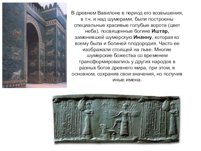 шумерами, были построены специальные красивые голубые ворота (цвет неба), посвященные богине Иштар, заменившей шумерскую Инанну, которая ко всему была и богиней плодородия. Часто ее изображали стоящей на льве. Многие шумерские божества со временем трансформировались у других народов в разных богов древнего мира, при этом, в основном, сохранив свои значения, но получив иные имена.