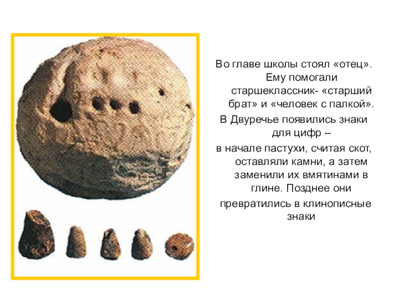 в начале пастухи, считая скот, оставляли камни, а затем заменили их вмятинами в глине. Позднее они