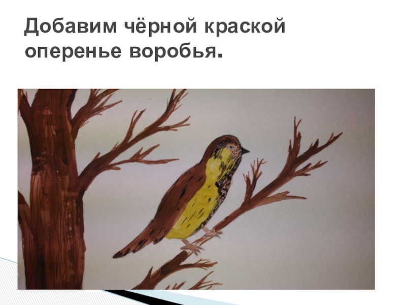 Слайд 12Добавим чёрной краской оперенье воробья.