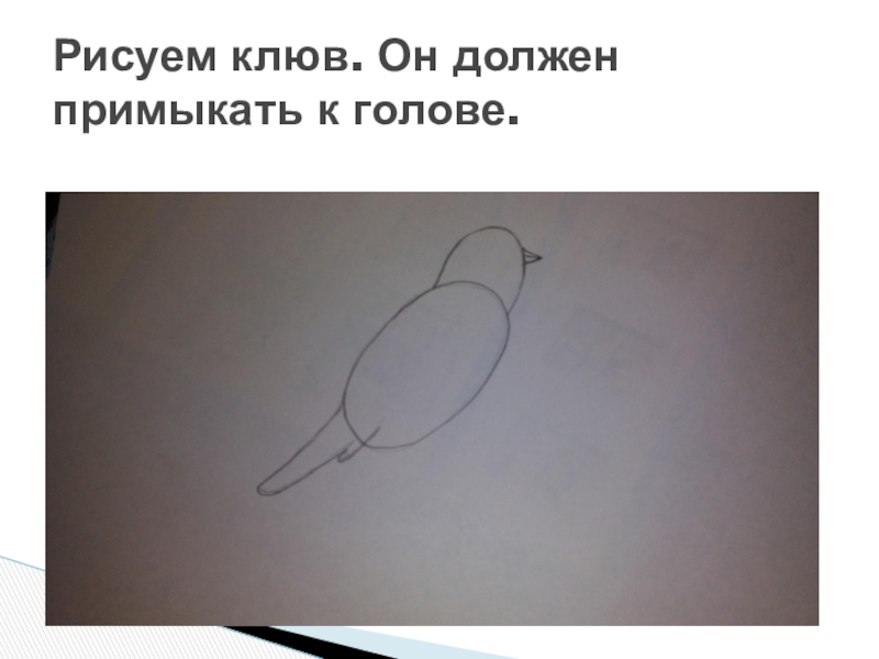 Слайд 5Рисуем клюв. Он должен примыкать к голове.